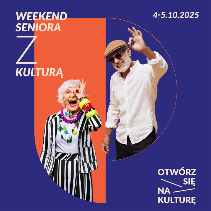Grafika promująca Weekend Seniora z Kulturą, 4–5 października 2025 – uśmiechnięci seniorzy i hasło Otwórz się na kulturę.